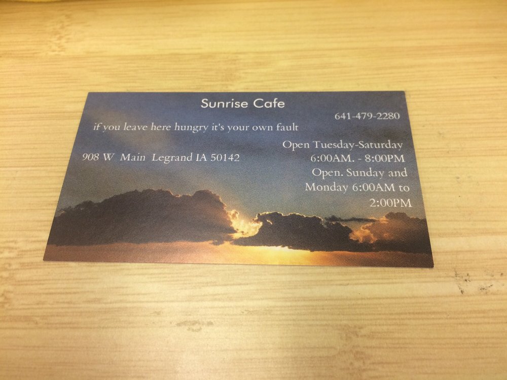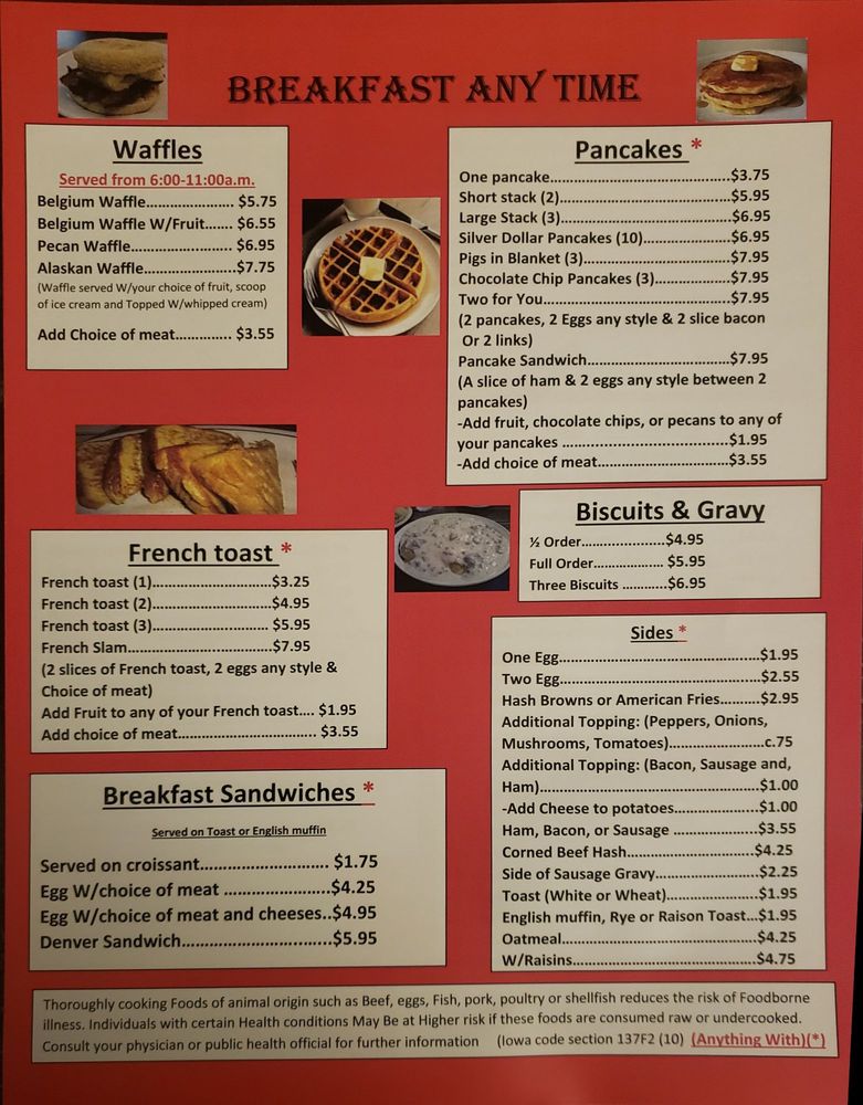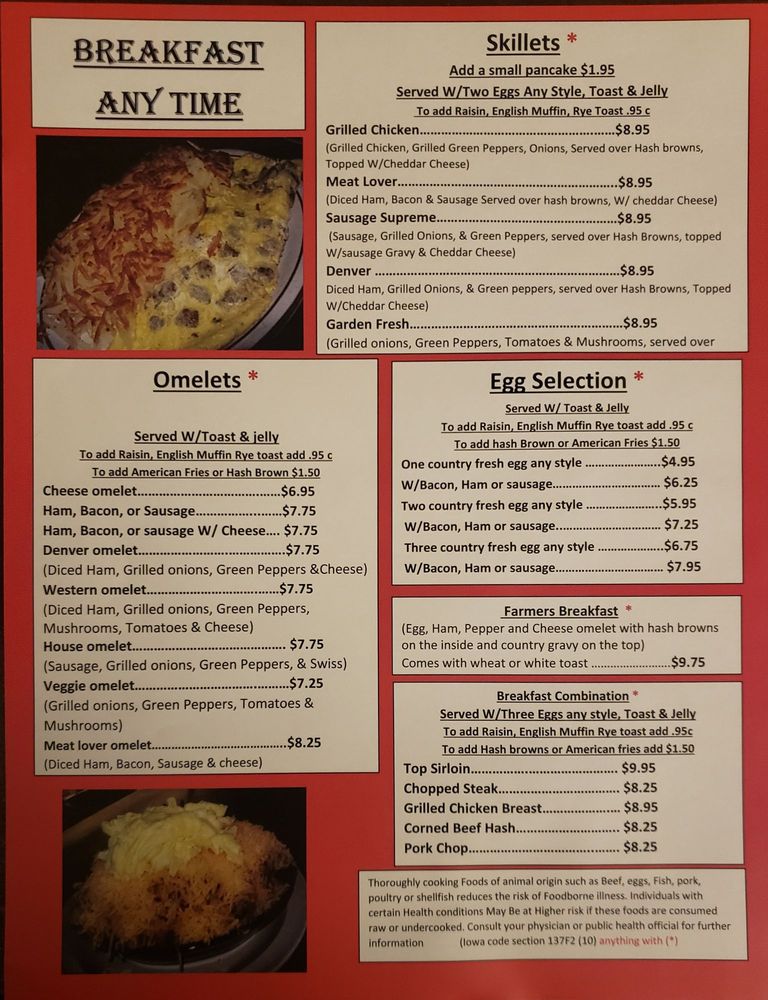 Welcome to Sunrise Cafe, a hidden gem nestled in Le Grand, Iowa, serving up hearty American breakfast and brunch fare that ensures you never leave hungry. With a vibrant menu that boasts everything from rich omelets to meat-packed skillets, each dish is crafted to provide a satisfying start to your day.